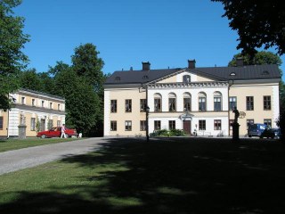 Taxinge slott - "kakslottet". I bottenvåningen finns ett café som dock inte öppnar förrän om en timme. Huvudbyggnaden ritades av Carl Christoffer Gjörwell och uppfördes under 1800-talets första årtionde. En bil anländer och parkerar utanför den vänstra flygeln. Det är nog galleristen som ska öppna för dagen.
