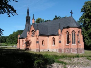 Jag vänder på gårdsplanen och åker tillbaka och stannar utanför Taxinge Kyrka. Den byggdes i början av 1700-talet men förföll under 1800-talet och 1861 ritade Adolf W. Edelsvärd en ny kyrka i gotisk stil som stod klar ett par år senare. Delar av murverket är kvar från den tidigare kyrkan. Väggarna är både i tegel och puts som är målat som tegel.