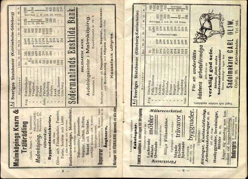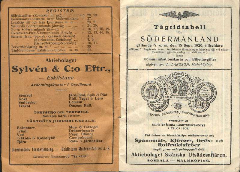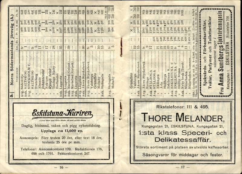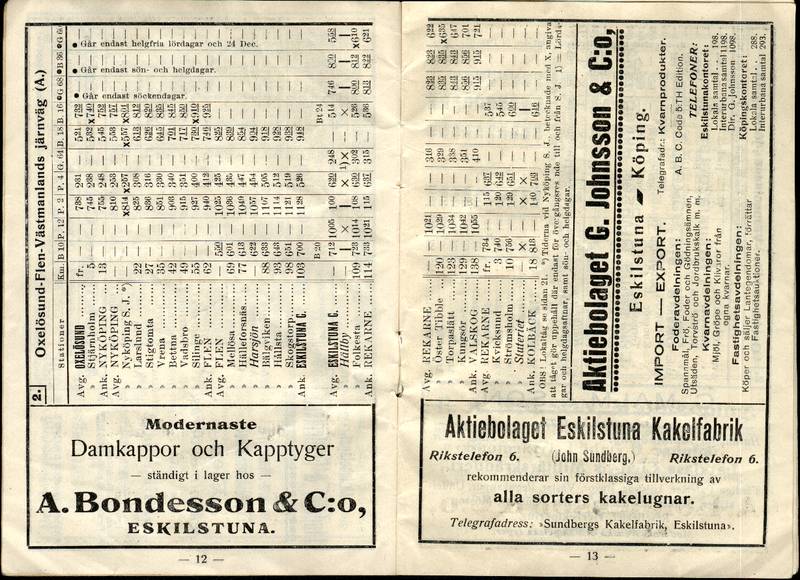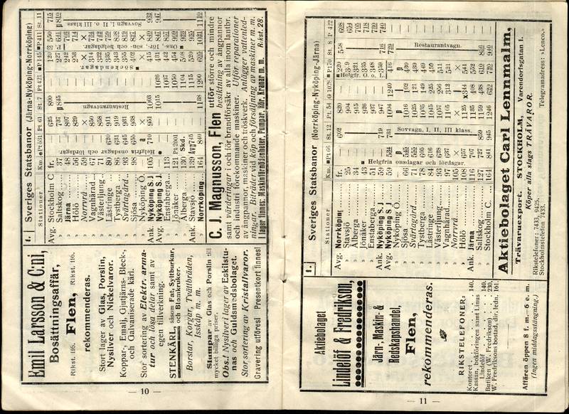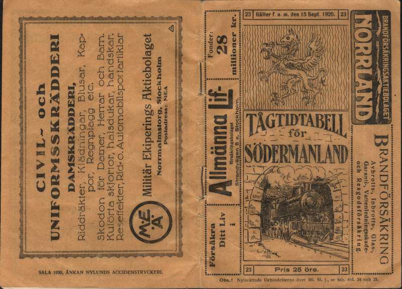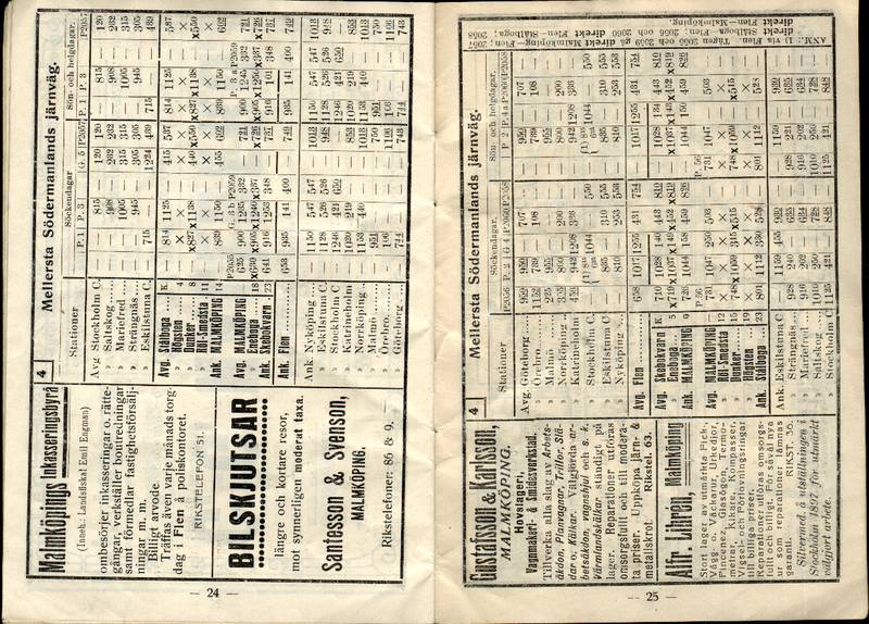En tågtidtabell utgiven av A. Larsson, Malmköping.
