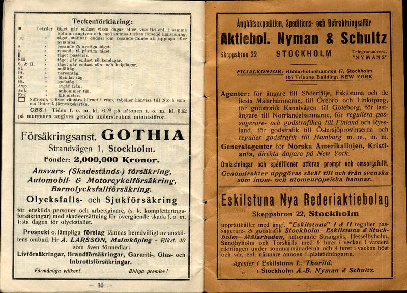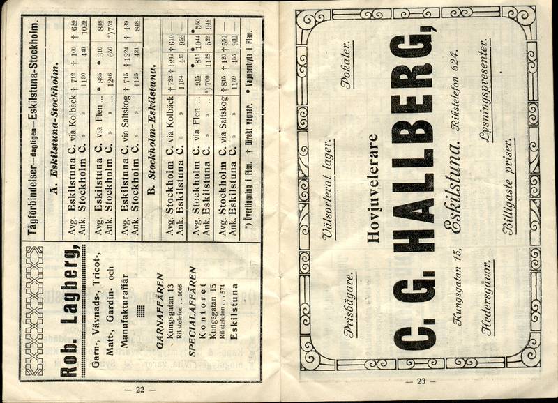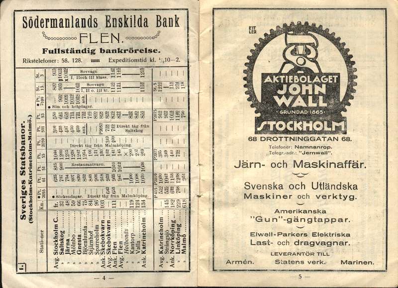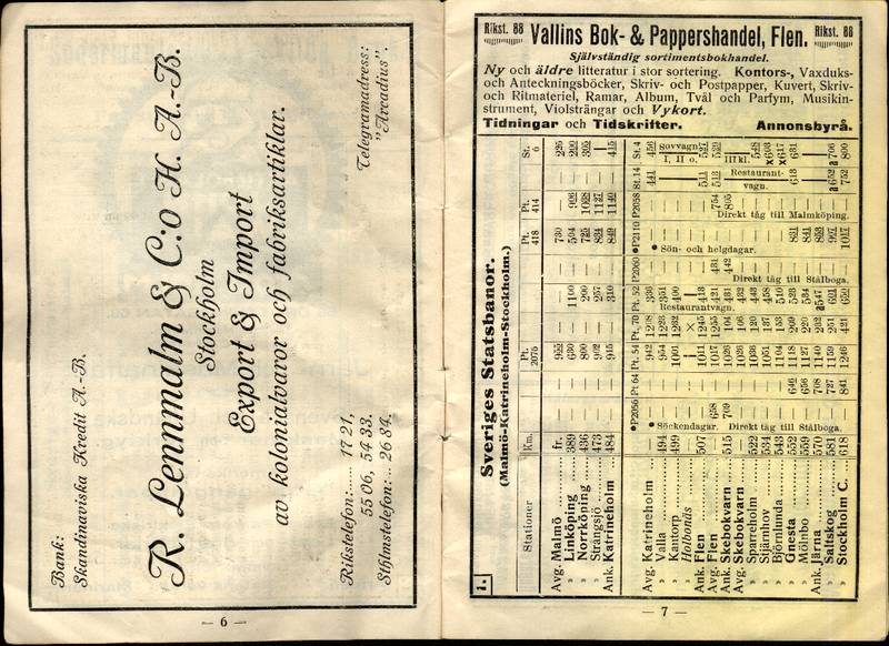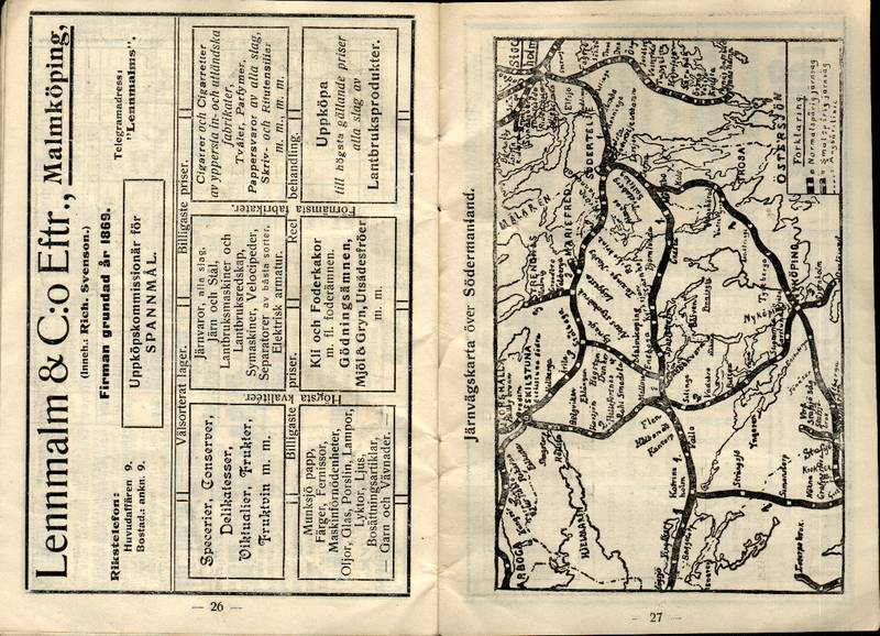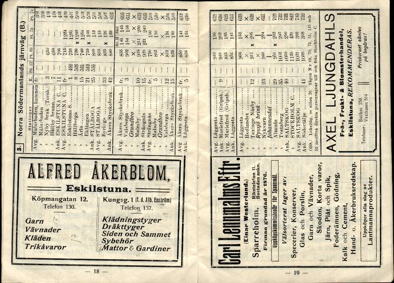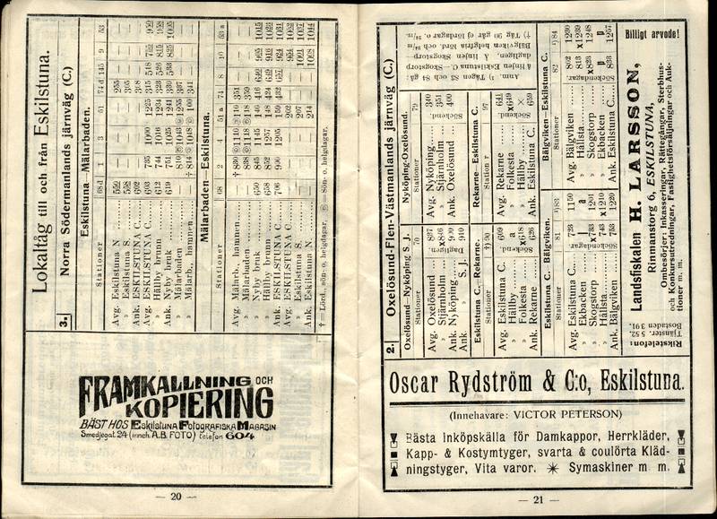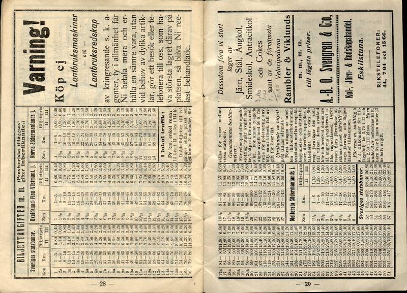 En tågtidtabell utgiven av A. Larsson, Malmköping.